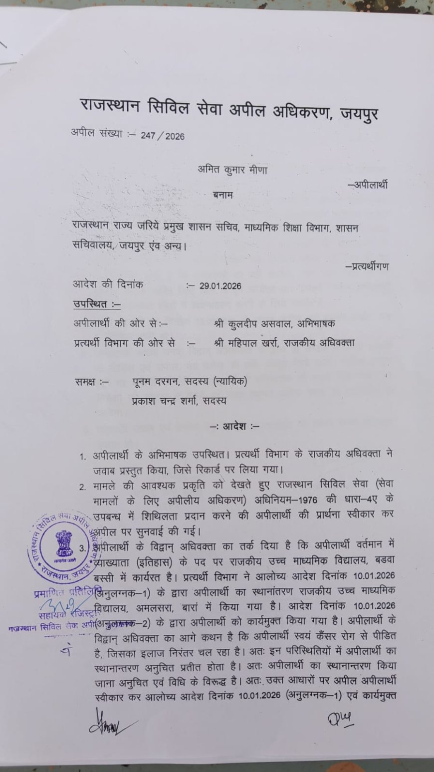 कैंसर पीड़ित लेक्चरर को बड़ी राहत, ट्रांसफर आदेश पर सिविल सेवा अपील अधिकरण ने लगाई रोक – एडवोकेट कुलदीप असवाल की प्रभावी पैरवी से मिली जीत