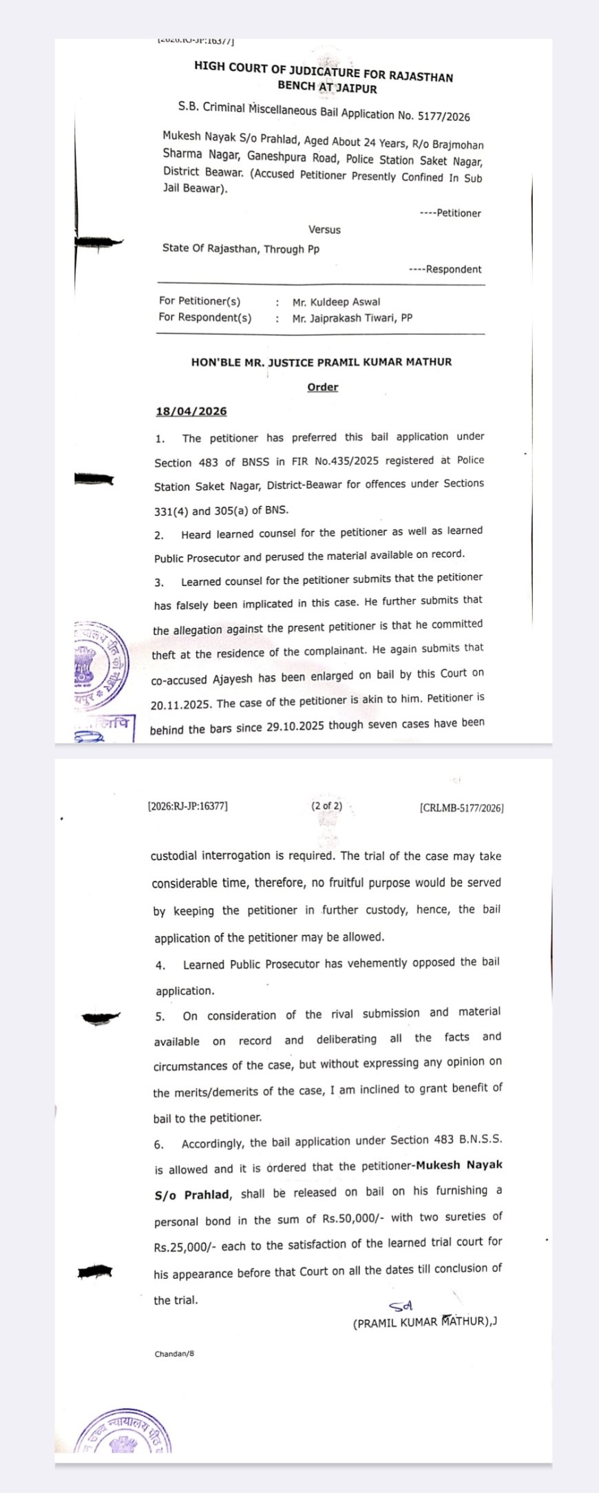 राजस्थान हाईकोर्ट: 7 केस पेंडिंग होने के बावजूद मिली जमानत, एडवोकेट कुलदीप असवाल की प्रभावशाली पैरवी बनी मिसाल